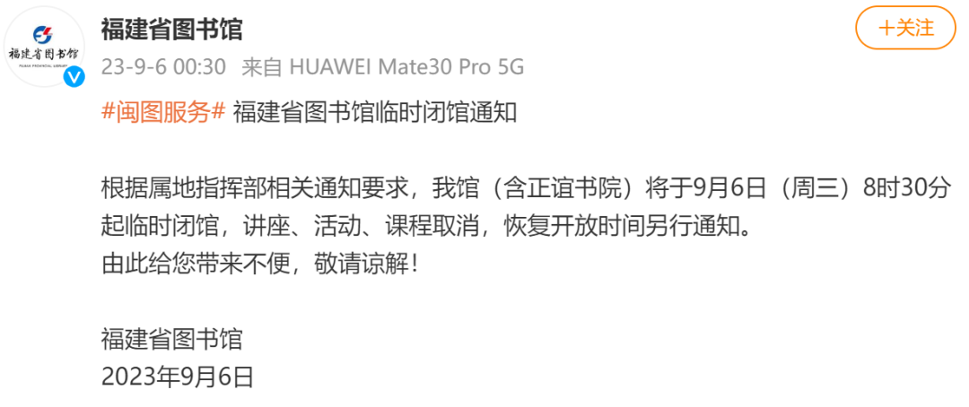 根据气象部门暴雨红色预警信号,为保障广大游客的人身及财产安全,三坊七巷、朱紫坊、上下杭、南公河口和梁厝等街区于2023年9月5日24时起暂时关闭,恢复开放时间另行通知。已预定门票的游客可从原渠道办理退款事宜。由此给您带来的不便,敬请谅解。