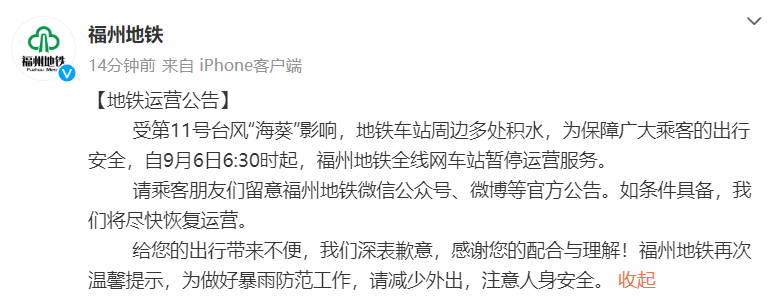 受第11号台风“海葵”影响,地铁车站周边多处积水,为保障广大乘客的出行安全,自9月6日6:30时起,福州地铁全线网车站暂停运营服务。