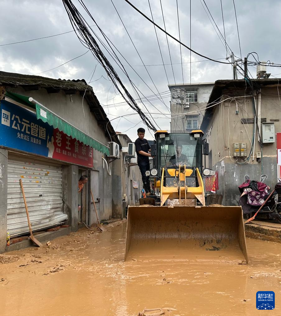 7日上午7时,为尽快疏通淤积道路,村干部、志愿者们再次投入清扫村道的工作中,并出动多辆铲车配合清淤作业。多名村干部从汛情发生以来,一直守在村里,他们继续帮村民清理房前屋后,指挥铲车在主干道安全作业。