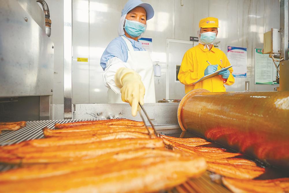 11日,在福清市城头镇的胜田(福清)食品有限公司,工人在自动化烤鳗生产线上忙碌。近年来,福清市聚焦鳗鱼产业发展,不断延伸养殖、加工、销售等全产业链,加速形成鳗鱼产业集群,鳗鱼产品热销东南亚、欧美等国家和地区,有效增加村民收入,助推乡村产业振兴。(谢贵明 摄影报道)