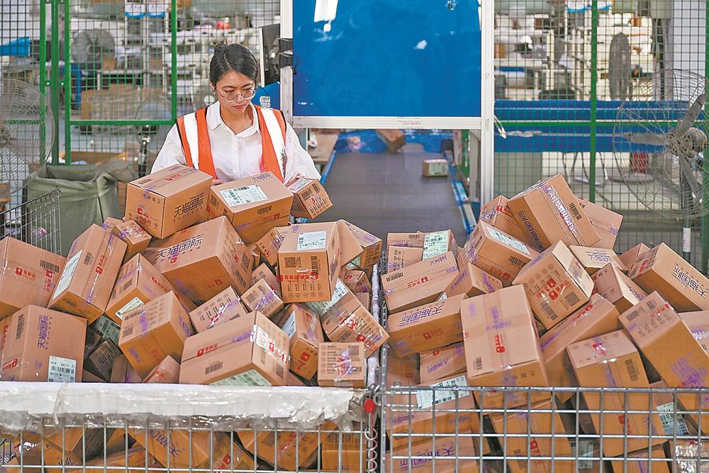 在平潭跨境电商园4号仓库,工作人员正在揽收保税电商订单包裹。江信恒 摄
