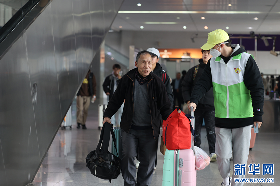 宁德站志愿者为老年旅客提行李。新华网发(王勇富 摄)