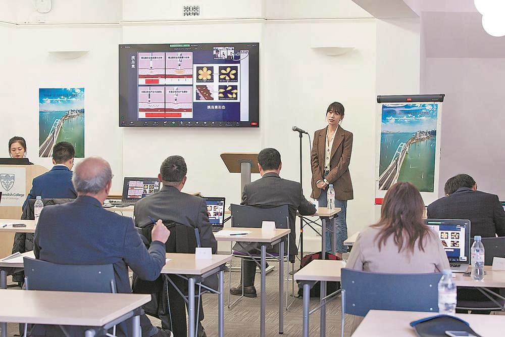 在英国剑桥大学举行的大赛决赛现场,赵俐翔团队介绍参赛项目“迈尔医疗器械及相关服务产业化项目”。(受访者供图)