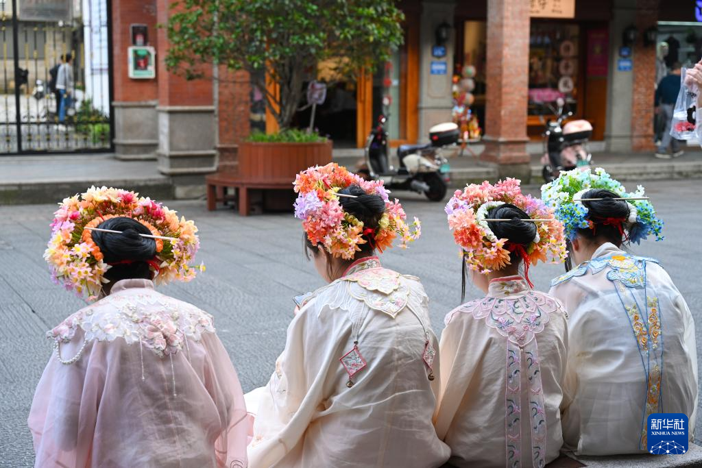 4月10日,在泉州中山路的一家蟳埔女簪花围体验店,老板为游客簪花。蟳埔女簪发戴花的古老民俗被称为“簪花围”。2023年初,网络上掀起“簪花围”热潮,各地游客慕名前来体验。新华社记者 周义 摄