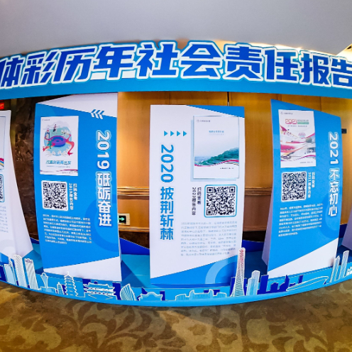 图为福建体彩历年社会责任报告展示。新华网发(福建省体育彩票管理中心供图)