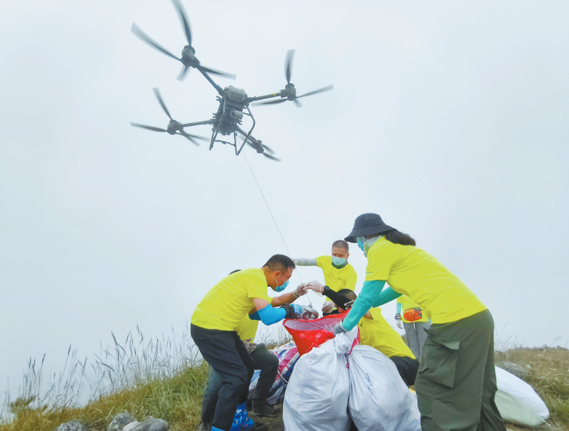 据活动主办方介绍,当日共有志愿者将近40人,由专业的户外运动爱好者和熟悉地形的当地村民组成,随行还有医务人员。志愿者分两队,第一队由一名向导带着江山镇干部和环卫工人爬山一个小时左右到达1、2号垃圾集中收集点清运垃圾。第二队由以野狼户外志愿者为主的20余人一路前往山顶进行垃圾清运。由于当天山区云雾大、能见度低,增大了空运垃圾的难度。志愿者飞手克服不利的气象条件,精准进行空投空运。垃圾空运下山后,统一送往垃圾处理场。志愿者飞手告诉记者,仅用10多分钟就可完成一次运载,最远的一趟飞行距离3.6公里,高度920米。“当无人机穿越茫茫大雾安全降落时,人工搬运需要3—4小时一趟的路程缩减为空中10多分钟,真是科技改变生活。”现场的志愿者由衷感慨。