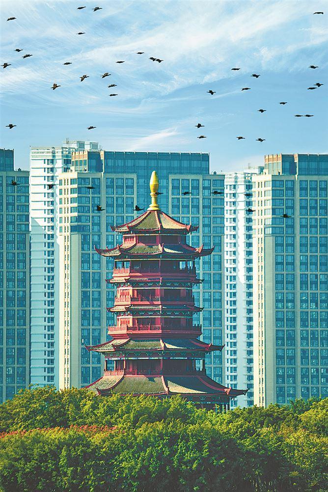 昨日鹭岛晴日高悬,暖意十足。飞鸟翩跹“戏”楼阁。(拍客 白水 摄于杏林阁)