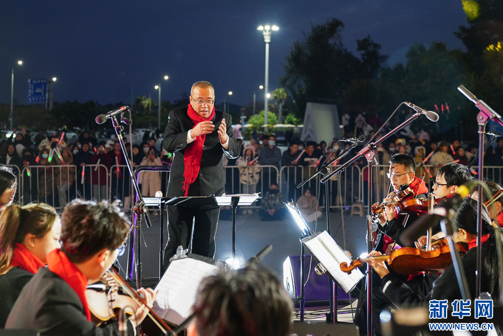 1月1日清晨6时许,泉州石狮红塔湾海岸公园,交响乐团在演奏乐曲,吸引很多市民、游客前来欣赏。新华网 肖和勇 摄