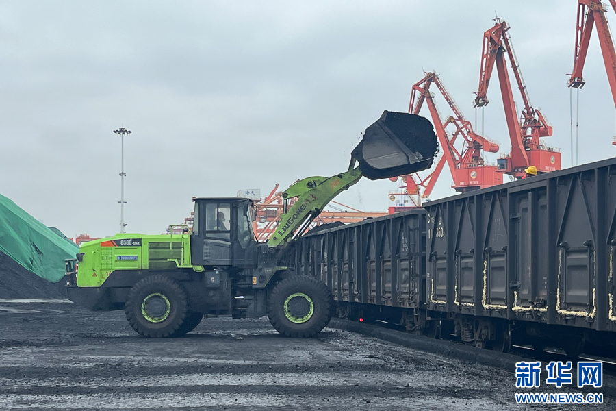 1月23日,厦门铁路物流营业部石湖山码头专用线上,挖掘机将原煤装上火车。新华网发(刘秋婷 摄)