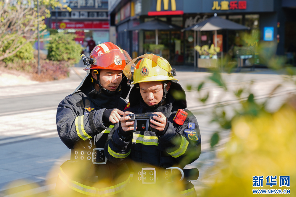 1月30日,漳州市龙文区宝龙广场,蓝田消防救援站的消防员使用无人机开展重点单位“六熟悉”工作。新华网 肖和勇 摄