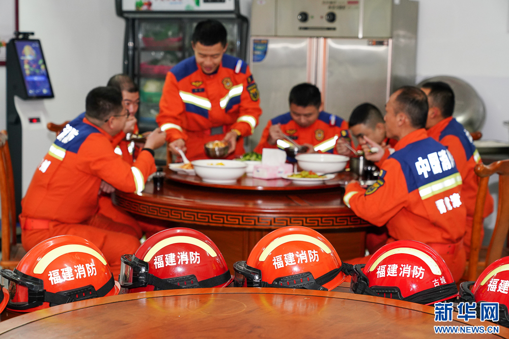 1月30日傍晚,漳州芗城古城消防救援站,消防员换班就餐。因执勤任务繁重,消防员就餐时仍身穿抢险救援服,便于饭后快速投入一线执勤。新华网 肖和勇 摄