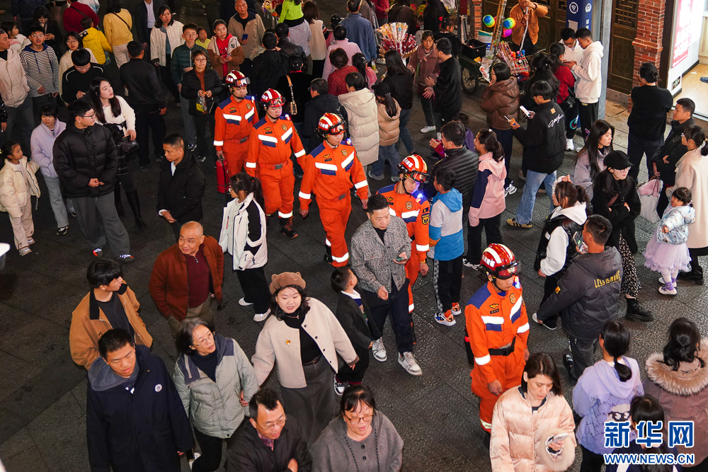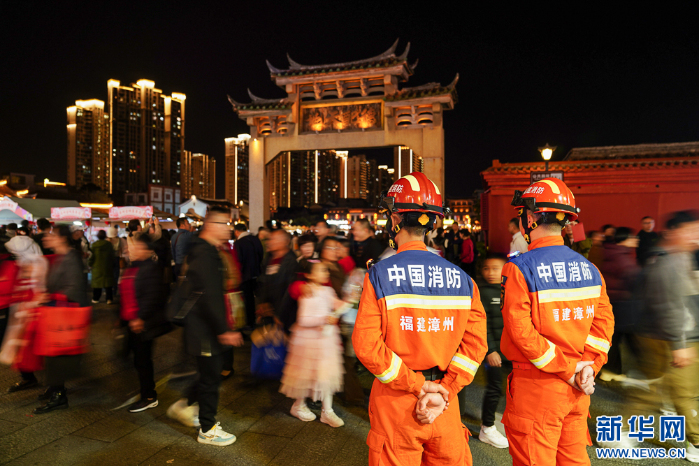 1月30日晚,漳州古城延安南路,游人如织。消防员在人群中开展沿街防火巡查。新华网 肖和勇 摄
