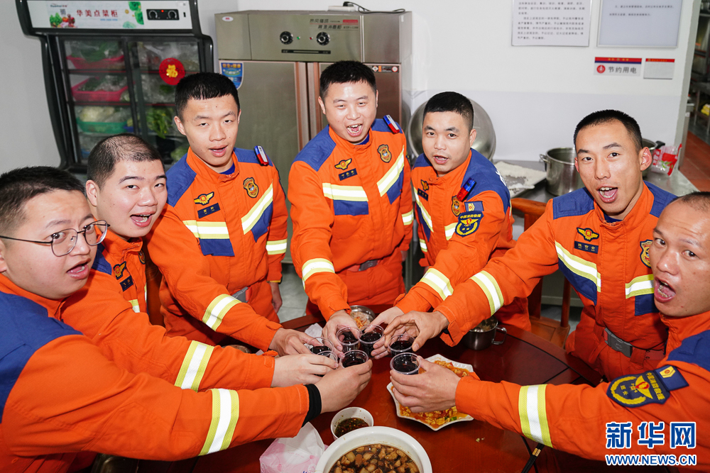 1月30日傍晚,漳州古城消防救援站,换班就餐的消防员以饮料碰杯迎新年。新华网 肖和勇 摄