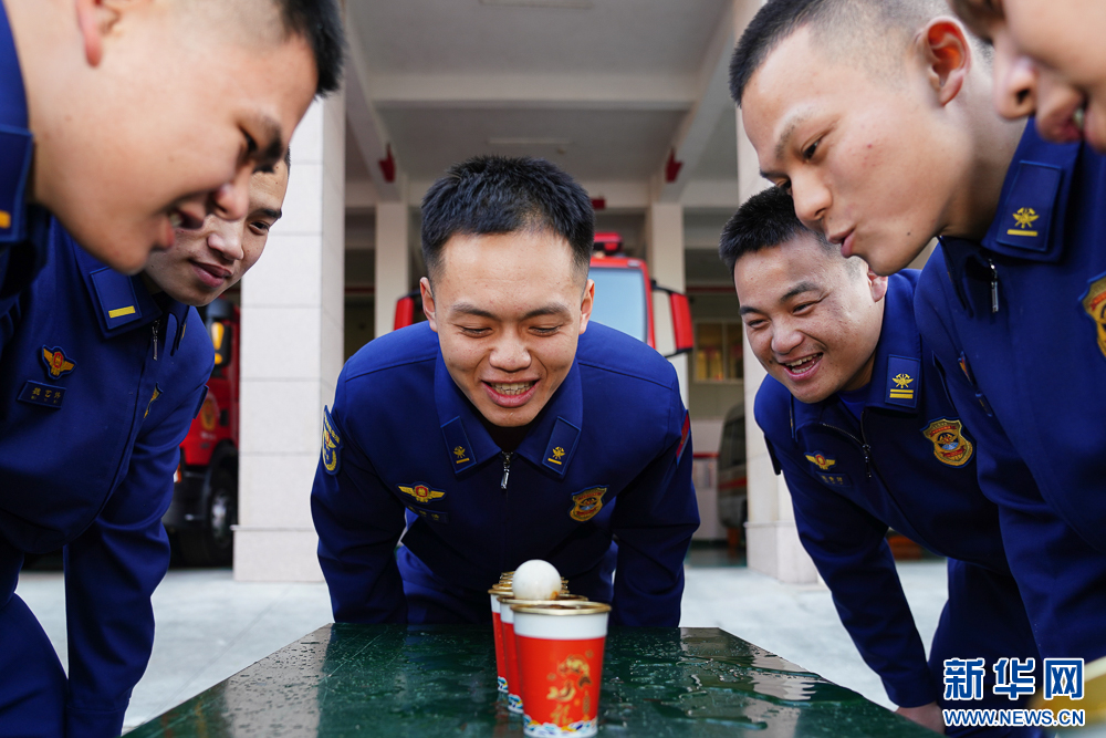 1月30日,漳州特勤消防救援大队一站,消防员在休息时间玩“乒乓球过桥”游戏。新华网 肖和勇 摄