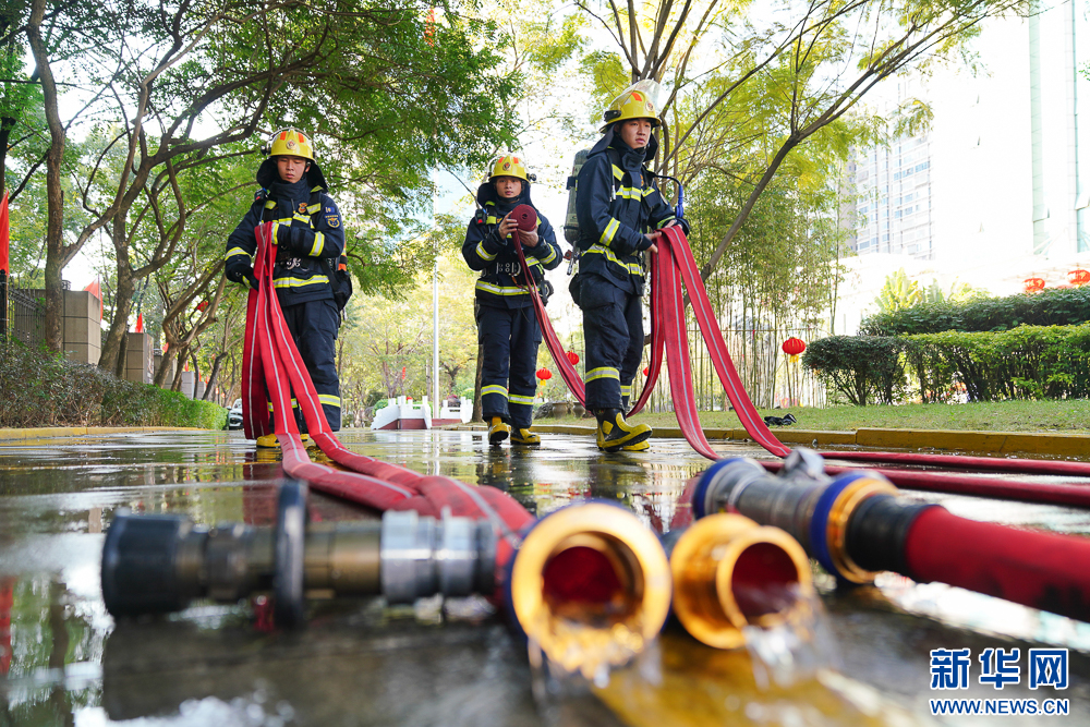 1月30日,漳州市龙文区宝龙广场,蓝田消防救援站的消防员在开展重点单位“六熟悉”工作,现场测试市政消防栓出水情况。新华网 肖和勇 摄