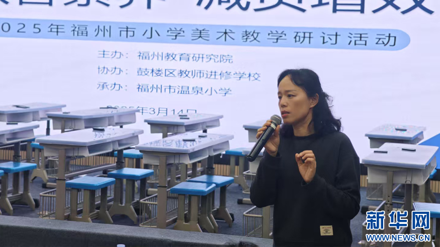 福州教育研究院小学美术教研员叶莹主持评课议课环节。新华网发(主办方供图)