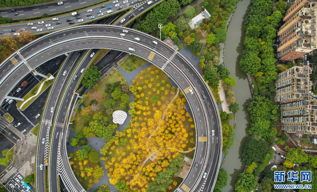 位于福州浦上大道和闽江大道交汇处的黄花风铃木公园。新华网 蒋巧玲 摄