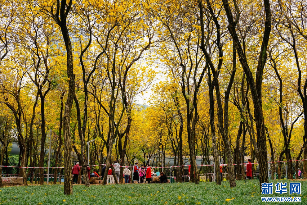 绿地之上的一树树金黄,点亮了一城春色。新华网 蒋巧玲 摄