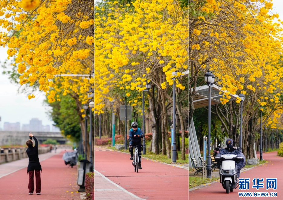 春日的江滨步道,因为黄花风铃木的盛放,多了几分惬意(拼版照片)。新华网 蒋巧玲 摄