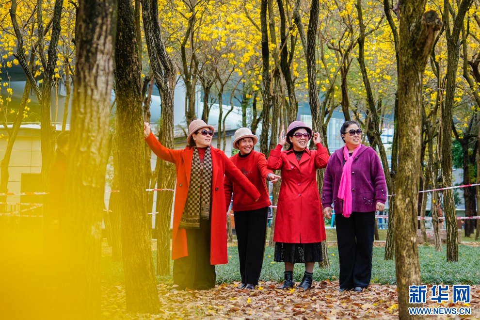 福州市浦上大道和闽江大道交汇处的黄花风铃木公园,几位老人正在赏花踏青。新华网 蒋巧玲 摄