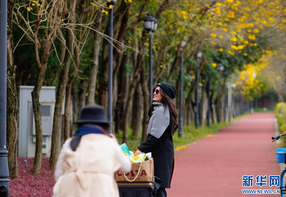 经过江滨路的路人在黄花风铃木树下拍照。新华网 蒋巧玲 摄