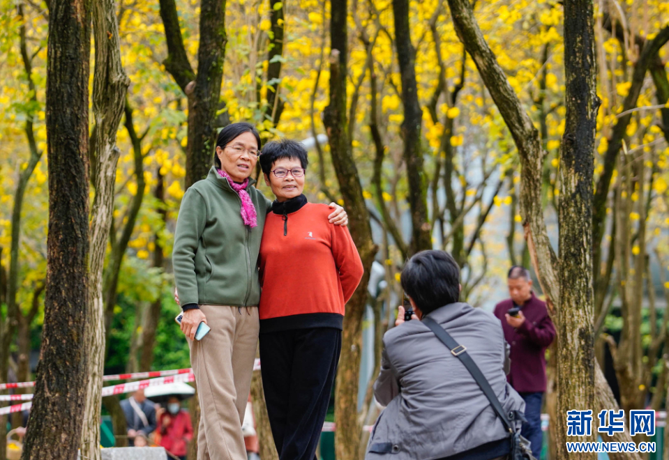 市民在盛开的黄花风铃木树下合影。新华网 蒋巧玲 摄