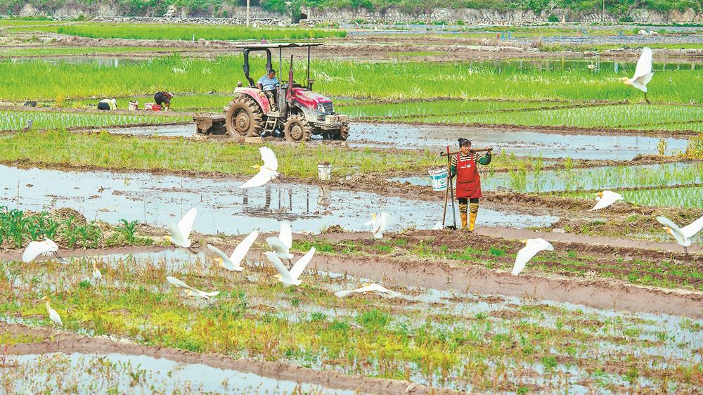 在高标准农田上,众多牛背鹭翩跹飞舞,与春耕场景相映成趣。
