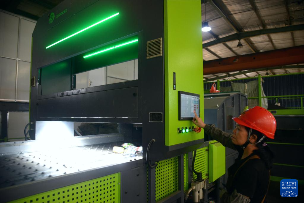 在位于福州马尾区的福州城投再生资源分拣中心,工人操作智能光选机筛选塑料瓶等可回收垃圾(9月13日摄)。新华社记者 李昊泽 摄
