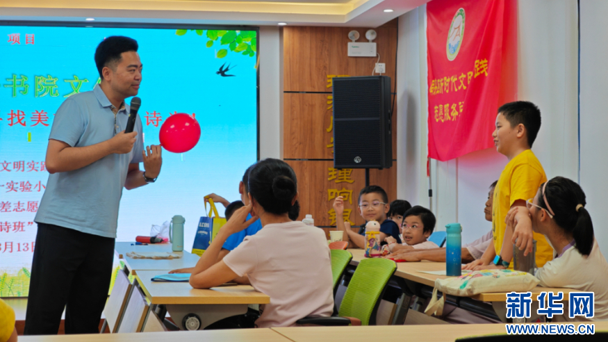 同安区举办的“文明实践+书院文化 遇见儿童诗”文明实践活动上,一名老师在与孩子们互动。新华网 刘默涵 摄