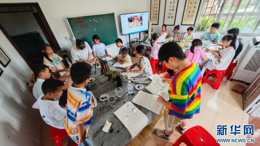 厦门市翔安区萃英书院里,孩子们跟随老师的教导,学习书法与国画。新华网 刘默涵 摄
