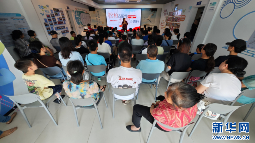 松柏社区新时代文明实践站里,社区居民聆听非遗文化讲座。新华网 刘默涵 摄