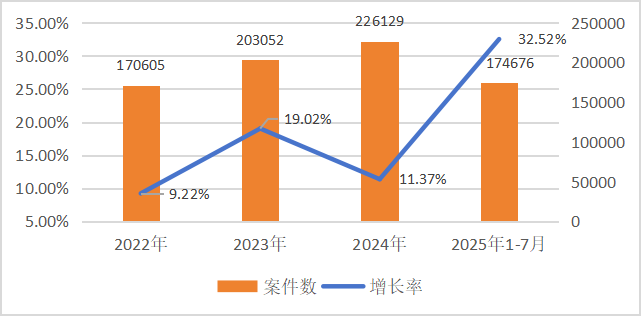 其中,商事案件总量逐年递增。2025年1月至7月,全省法院新收一审商事案件17.47万件,同比上升32.52%。2022年至2024年,商事案件每万人发生率从53.53件上升至61.08件,反映福建市场主体活跃度、参与度较高。同时,商事纠纷发生率低于全国均值,仍处于合理区间。大标的、连环交易案件较多,体现商业活动资金规模较大、交易模式复杂。
