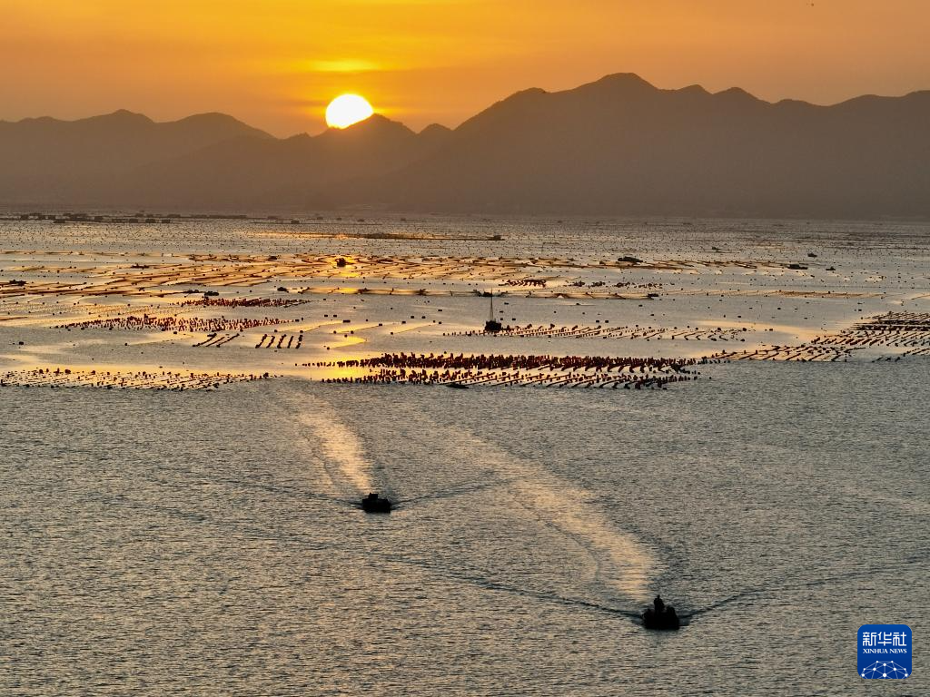 11月28日,福建省宁德市霞浦县海上养殖区两艘渔船在日落时分返港(无人机照片)。新华社记者 姜克红 摄