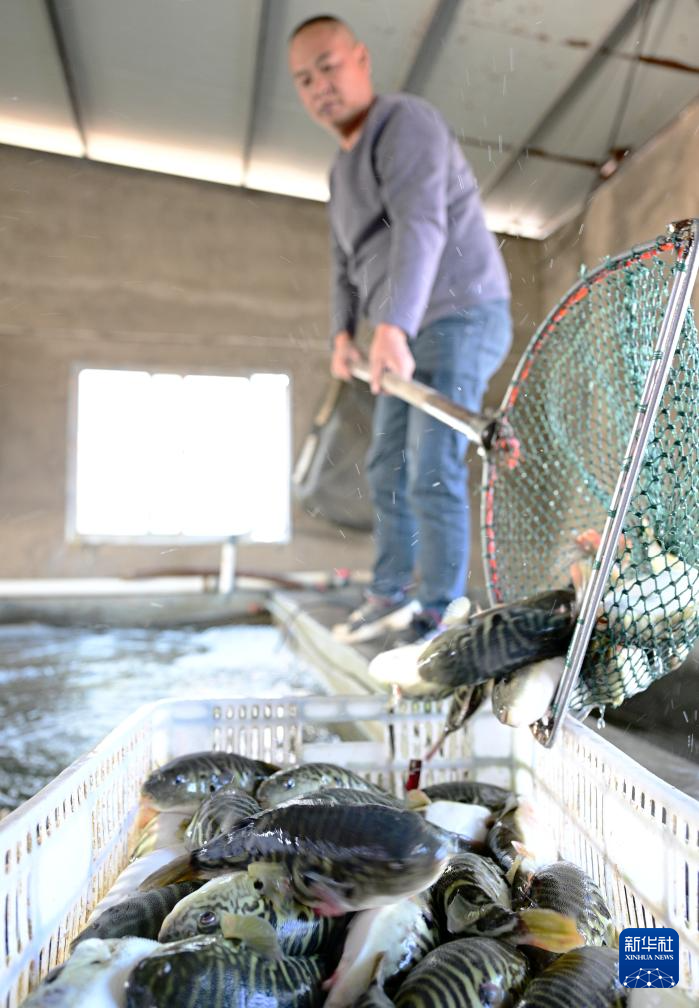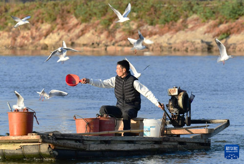 12月10日,东坂村河豚养殖户在给河豚投喂食物。新华社记者 魏培全 摄