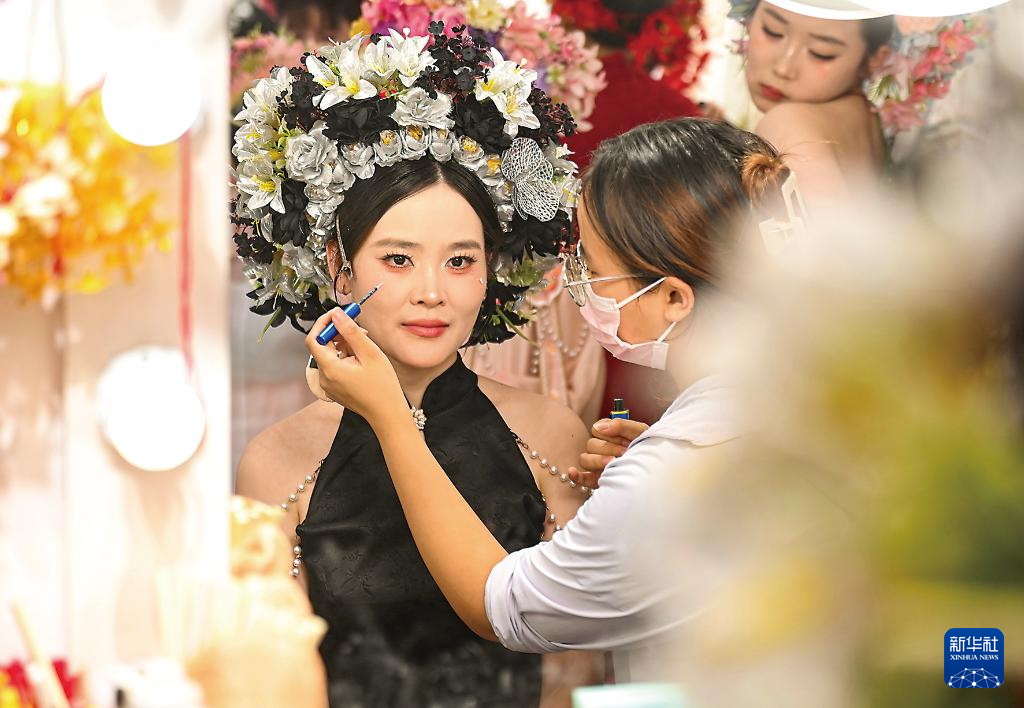 来自厦门的游客在泉州市蟳埔村的一家簪花旅拍店化妆(8月18日摄)。新华社记者 林善传 摄