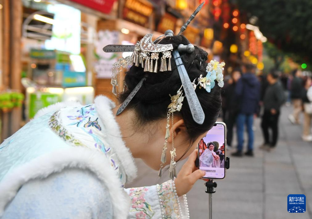 1月9日,游客头戴“三条簪”在福州三坊七巷南后街爱心树前打卡拍照。福州“三条簪非遗IP”入选全国“非遗融入现代生活”典型创新实践名单。新华社记者 林善传 摄