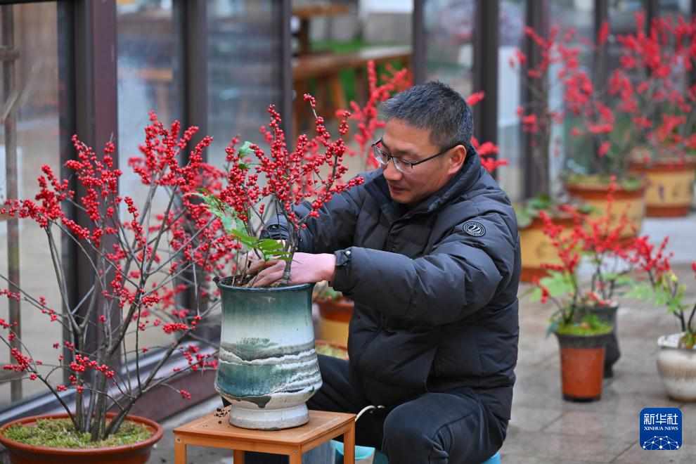 1月14日,位于福建省周宁县浦源镇的田园农业开发有限公司,企业负责人在整理冬青盆栽。新华社记者 姜克红 摄