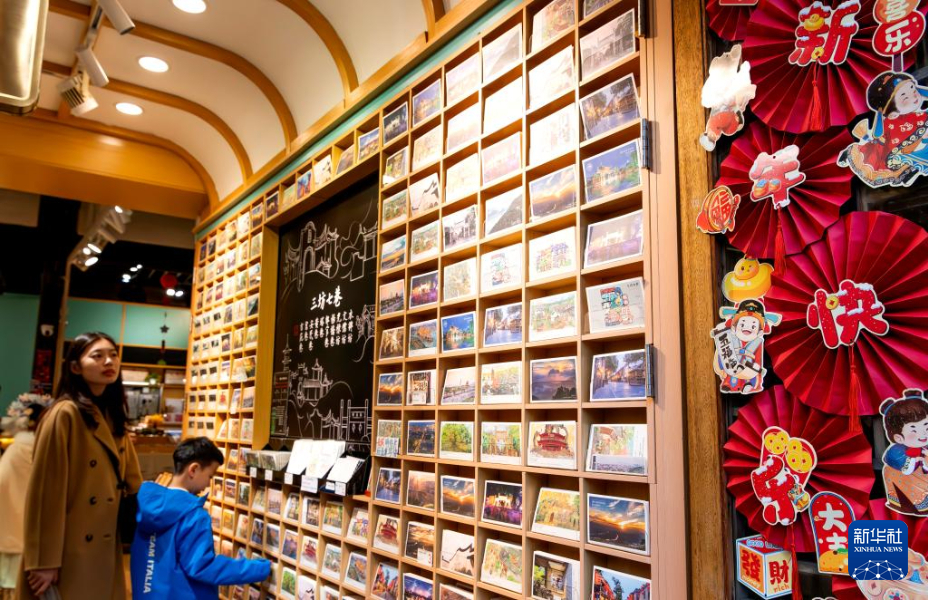 2月17日,游客在福州市三坊七巷旅游纪念品店里挑选旅游纪念品。新华社记者 魏培全 摄