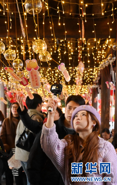 3月3日,游客在福州三坊七巷古厝里的花灯前拍照。新华社记者 林善传 摄