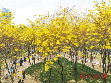 昨日,记者路过位于仓山区的黄花风铃木公园,看到公园里的黄花风铃木开花了。