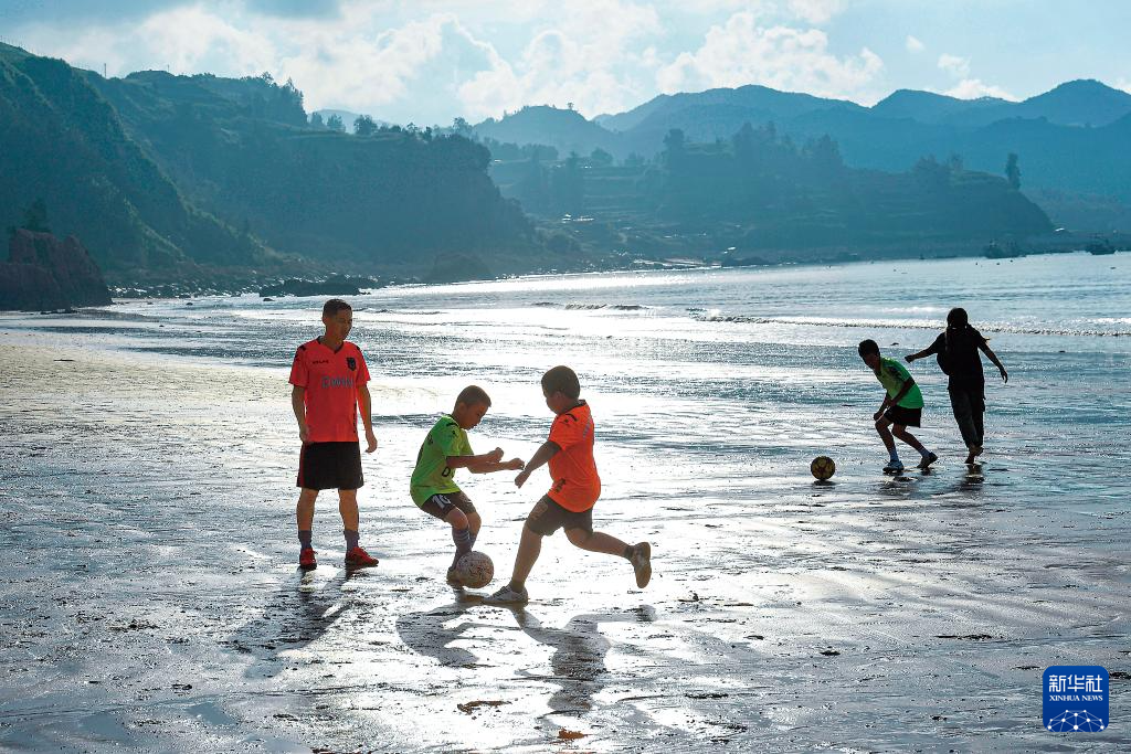 霞浦县下浒镇外浒沙滩上,“长风”足球队小球员们在海边踢球。新华社记者 姜克红 摄